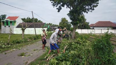 Babinsa Bersama Warga Melaksanakan Gotong Royong Bersihkan Ranting Pohon Kanan Kiri Jalan