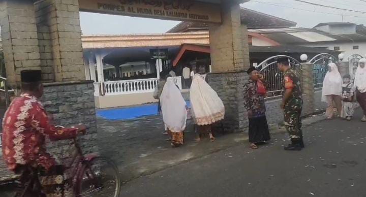 Babinsa Desa Kalianyar, Koramil 0810/06 Kertosono, Kodim 0810/Nganjuk, Serda Catur Kriswanto melaksanakan monitoring sekaligus pengamanan pelaksanaan Sholat Idul Fitri 1447 H di Masjid Baitul Izzah, Jalan Morogati, Desa Kalianyar, Kecamatan Kertosono.
