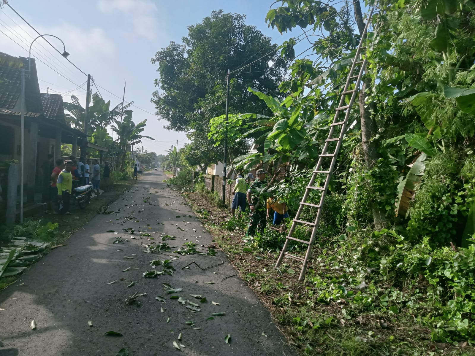 Peltu Sumeh kuswanto selaku Babinsa desa Katerban Koramil 0810/08 Baron, melaksanakan pendekatan dan pembinaan secara langsung ikutserta dalam kegiatan karya bakti pembersihan ranting pohon dikanan kiri jalan diwilayah dusun sumur putat desa katerban, hal ini dilakukan apabila musim hujan yang disertai angin kencang dapat membahayakan keselamatan pengguna jalan, untuk demi keamanan dan keselamatan pengguna jalan Babinsa dan masyarakat sekitar memotong ranting ranting pohon dan merapikannya, giat ini secara tidak langsung akan terwujudnya kemanunggalan TNI dengan rakyat.