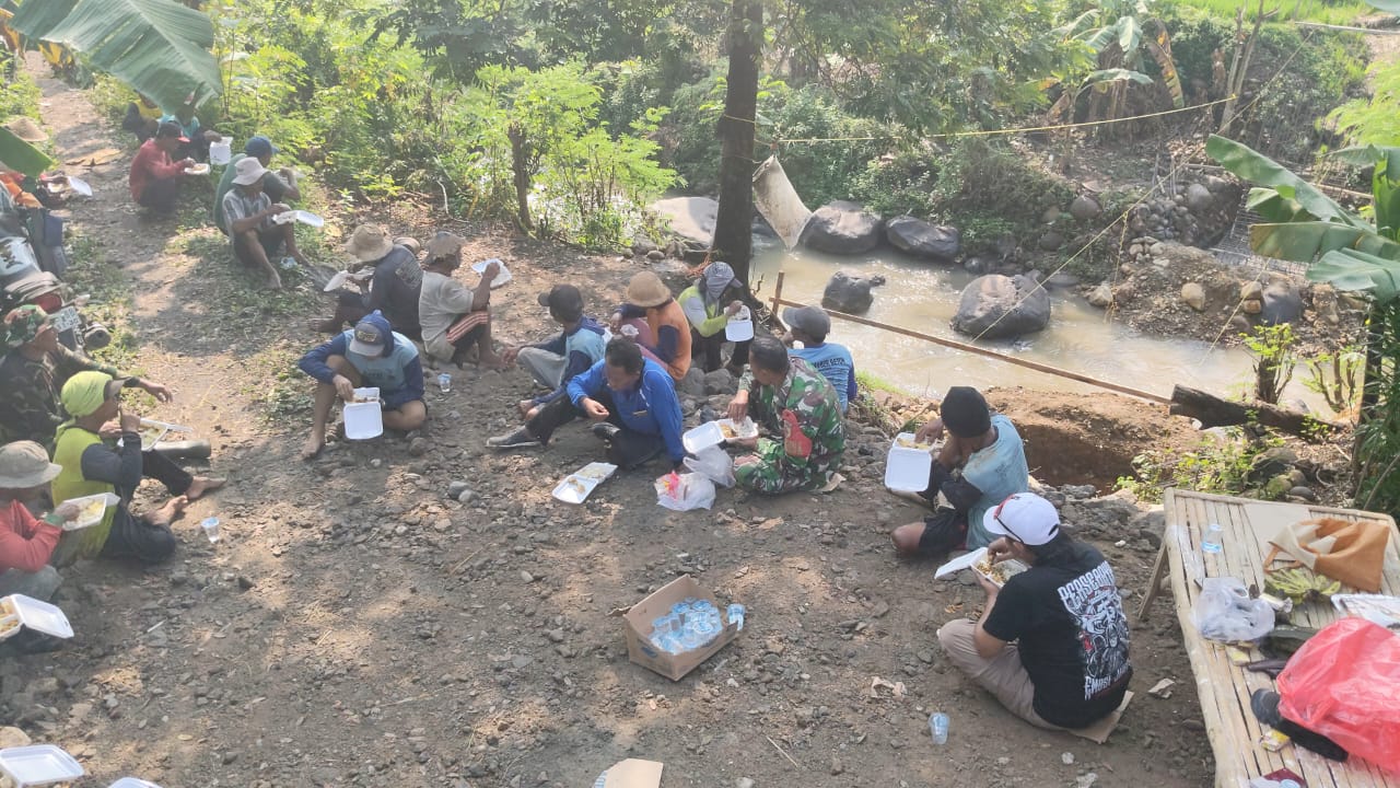 Kegiatan sederhana tersebut menjadi momen penuh keakraban antara aparat TNI dan masyarakat. Dengan duduk bersama di pinggir aliran sungai, mereka menikmati hidangan sambil beristirahat dari pekerjaan fisik yang cukup menguras tenaga.