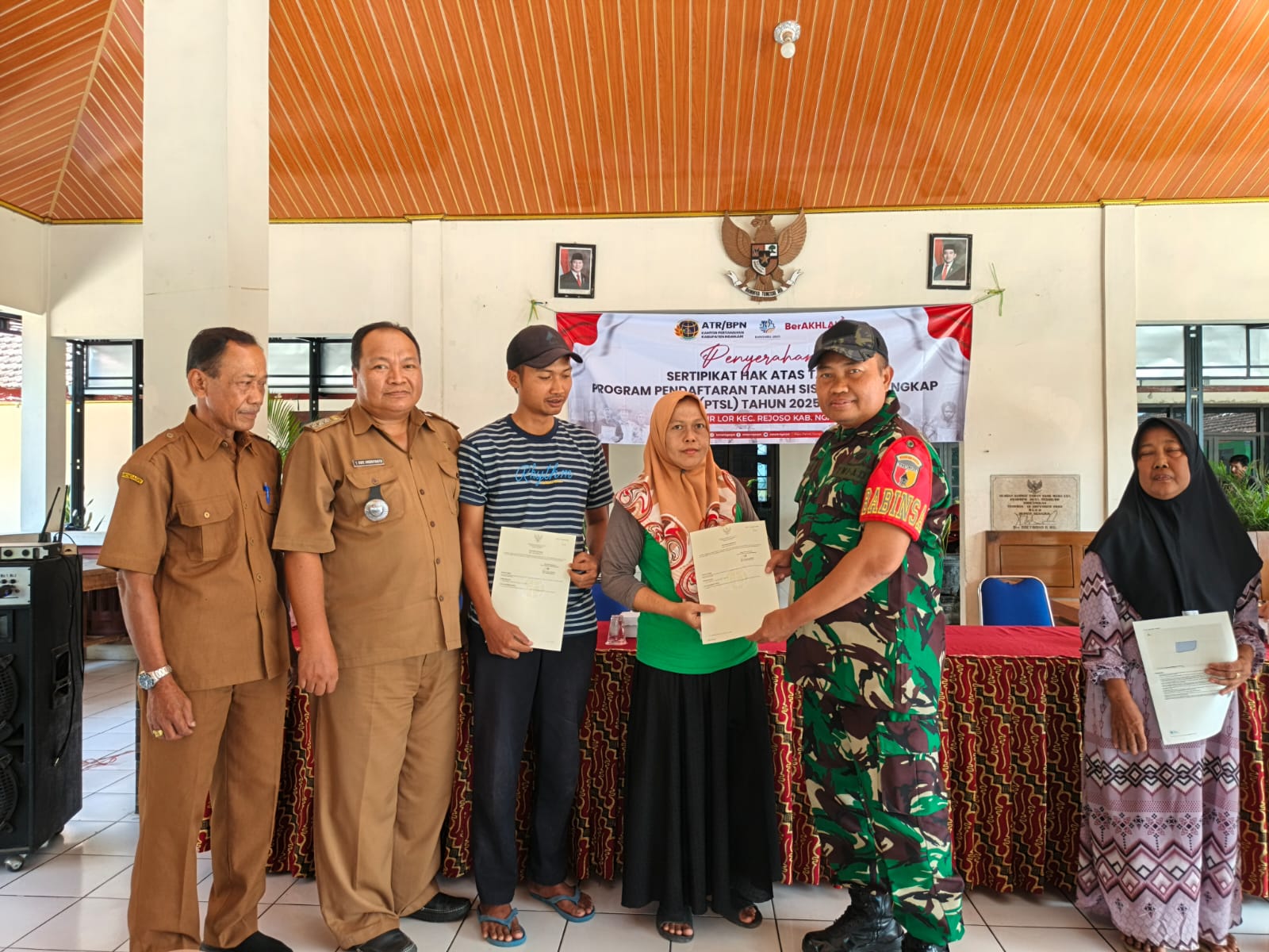 Nganjuk – Babinsa Koramil 0810/15 Rejoso Serka Sudarsono mendampingi kegiatan penyerahan sertifikat tanah kepada warga melalui Program Pendaftaran Tanah Sistematis Lengkap (PTSL) yang dilaksanakan di Balai Desa Musir Lor Kecamatan Rejoso Kabupaten Nganjuk. Rabu (15/10/2025)