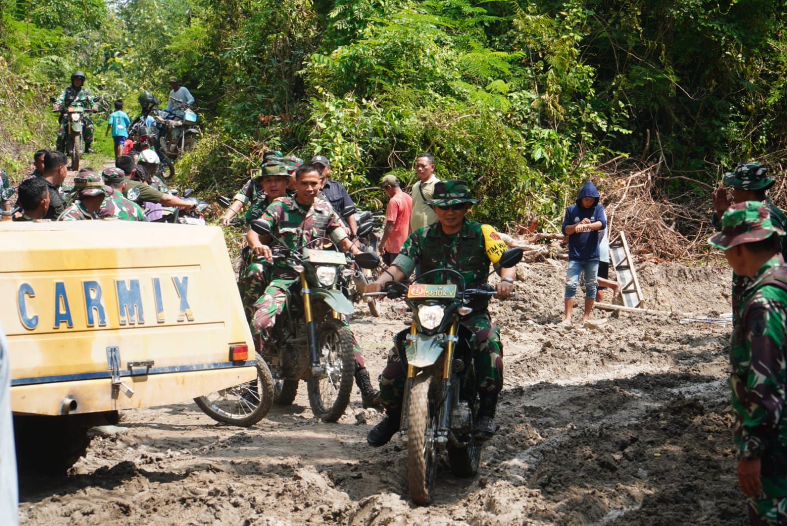 Nganjuk – Tim pengawasan dan evaluasi (Wasev) Pusterad menuju lokasi TMMD ke-124 Kodim 0810/Nganjuk memakai motor trail, di Desa Sumbermiri Kecamatan Lengkong Kabupaten Nganjuk, Pada hari Jumat (16/05/25).