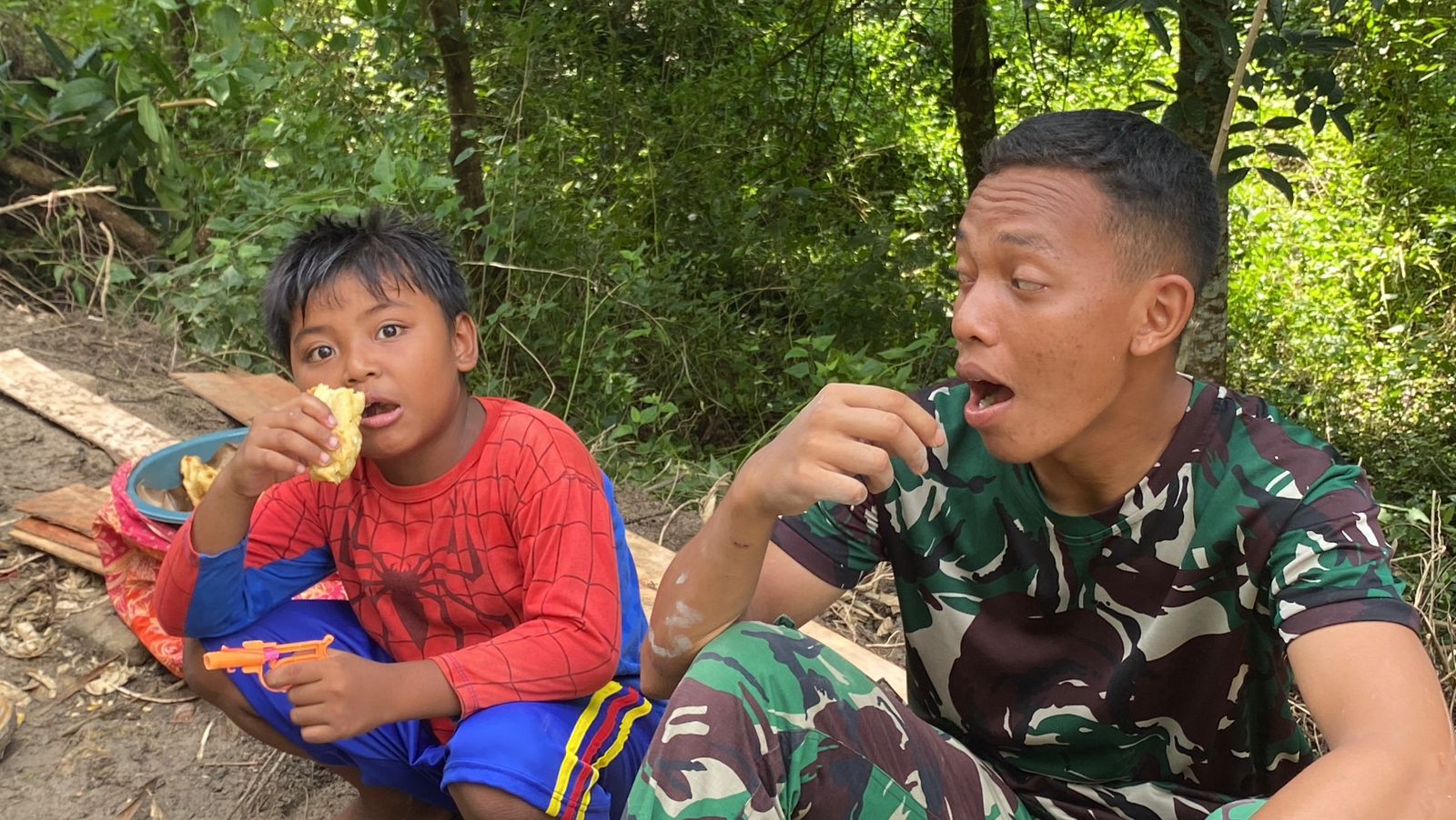 Pada kesempatan tersebut, anggota Satgas TMMD, salah satu anggota Satgas TMMD Ke 124 Kodim 0810/Nganjuk terlihat berbincang-bincang dengan para anak-anak sambil menikmati singkong goreng.