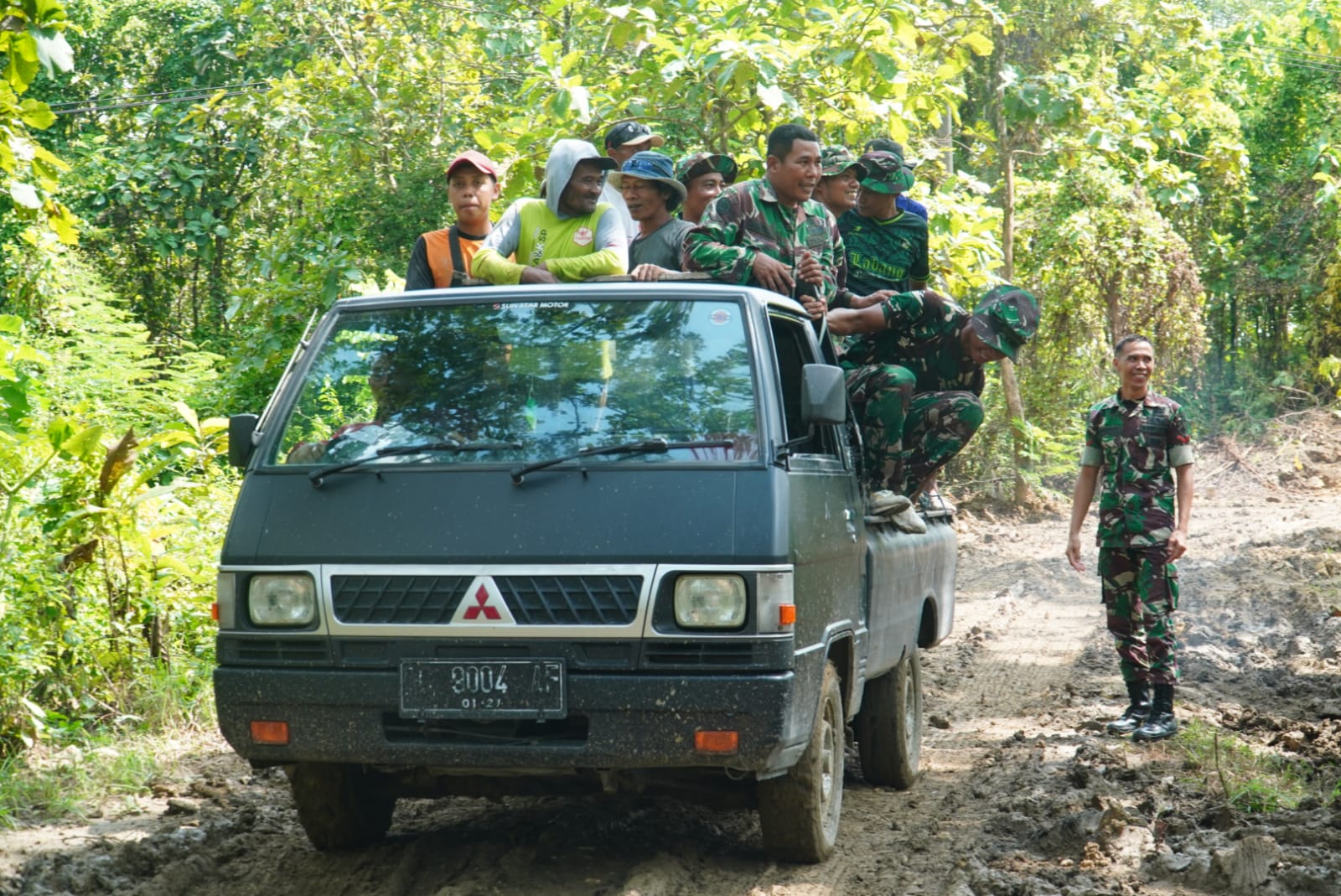 Personel Satgas bertempat di area perumahan desa Sumbermiri dan lokasi pengerjaan berada di tengah hutan sehingga saat menuju lokasi, para personel tersebut harus diangkut menggunakan Pick Up. Dengan penuh semangat, Satgas TMMD menaiki mobil pick up dari tempat tinggal menuju sasaran fisik pengecoran jalan.