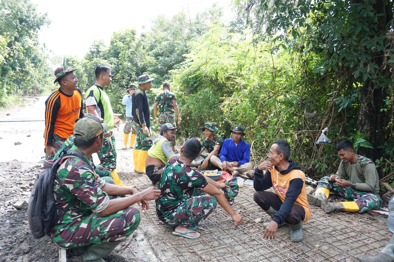 Momen Kebersamaan Satgas TMMD 124 Kodim Nganjuk dan Warga Saat Istirahat Kerja.