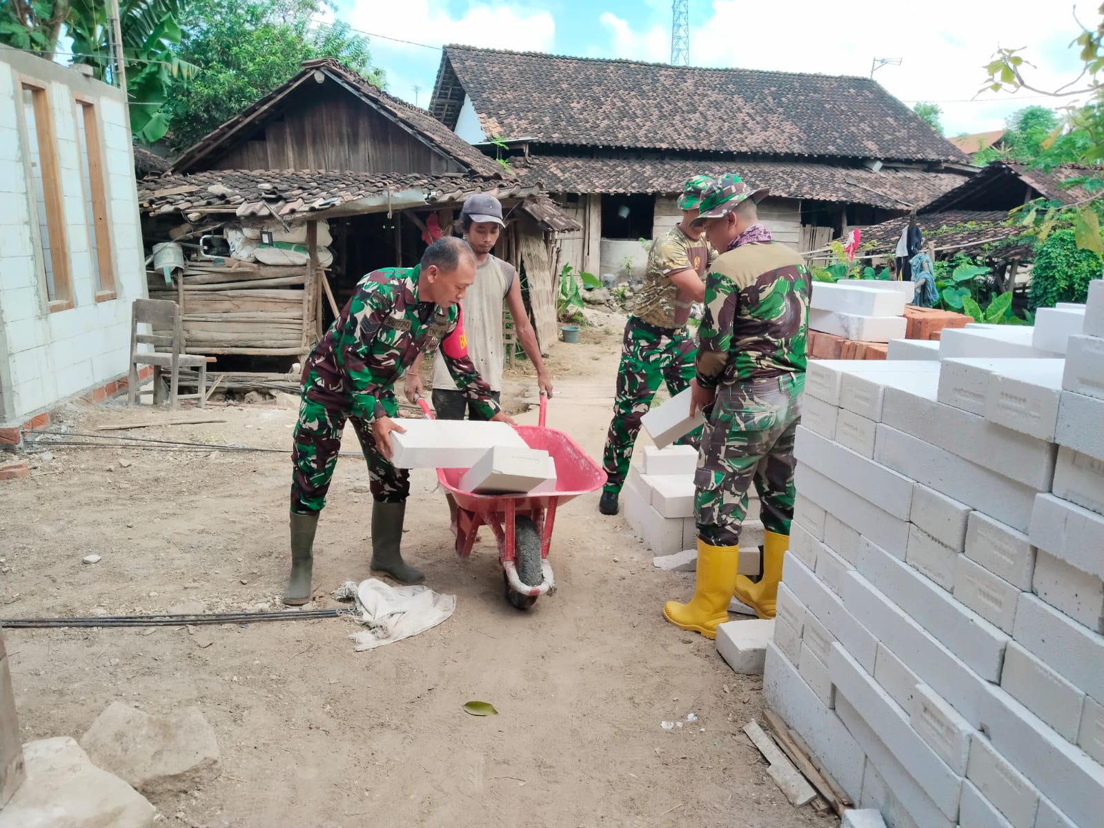 Serka Sutiono Babinsa Koramil 0810/20 yangbikut serta dalam kegiatan tersebut bekerja bersama sama dengan personel Satgas TMMD 124 dalam pembuatan rumah layak hini di desa Lengkong Lor.
