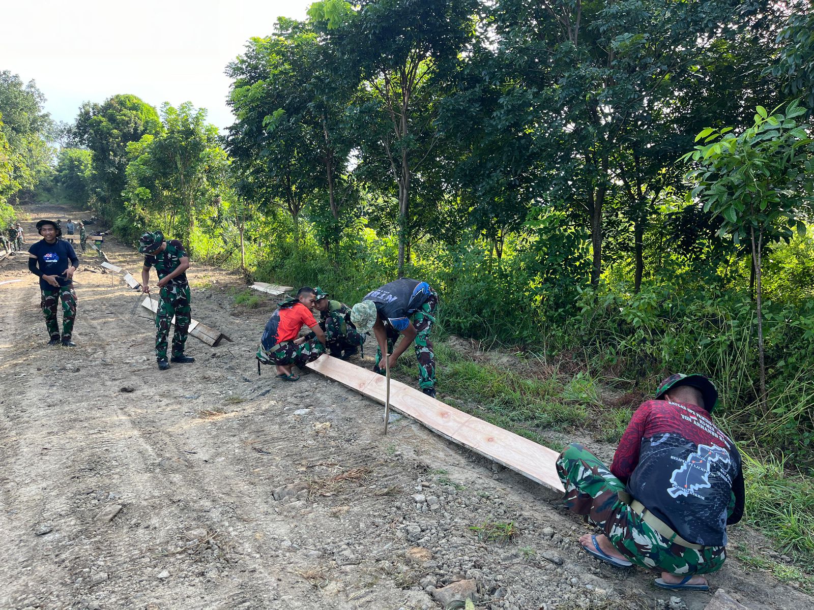 Nganjuk – Mengejar target fisik TMMD ke-124 Satgas TMMD Ke 124 Kodim 0810/Nganjuk bersama warga mulai memasang papan bekisting untuk program pengecoran jalan dari Desa Sumbermiri Kecamatan Lengkong menuju Dusun Suru, Desa Lengkong Lor Kec. Ngluyu Kabupaten Nganjuk, Minggu (11/05/2025).