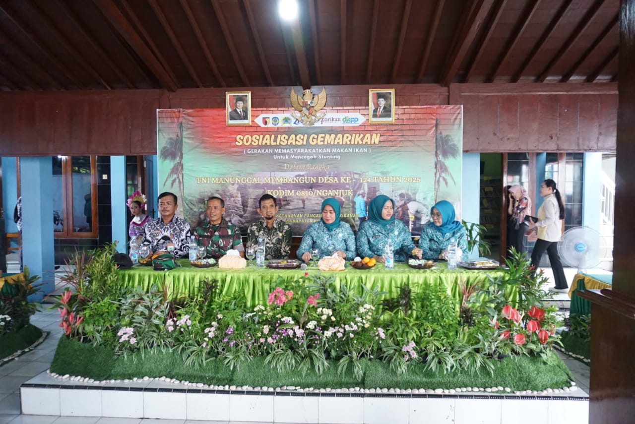 Nganjuk – Gerakan Memasyarakatkan Makan Ikan (Gemarikan) yang disosialisasikan Satgas TMMD 124 Nganjuk bekerja sama dengan Dinas Perikanan Kabupaten di Balai Desa Ketandan Kabupaten Nganjuk. Jumat