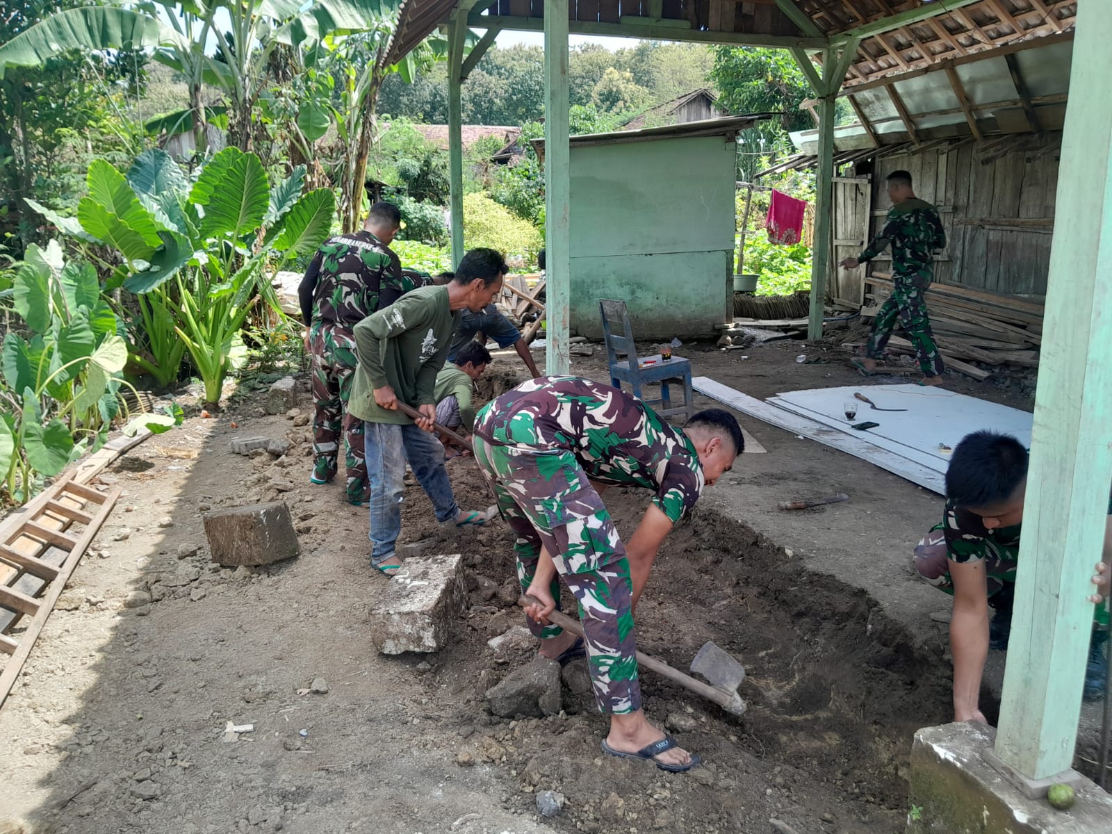 Nganjuk – Lengkong – Babinsa Ds.Sumbermiri Sertu Sunardi, membantu team Satgas TMMD dalam program Rumah Tidak Layak Huni (Rutilahu) untuk warga binaanya dua rumah Yaitu Milik Bpk.Yatemin Ds.Sumbermiri Rt.01 Rw.01 kecamatan lengkong kabupaten Nganjuk.