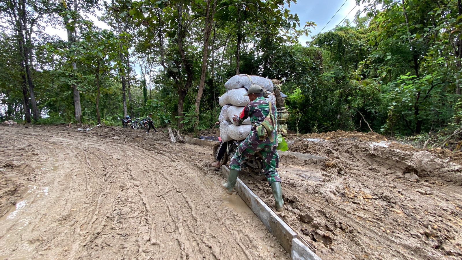 Kejadian ini terjadi ketika seorang warga yang mengendarai sepeda motor mengalami kesulitan melewati jalan berlumpur akibat kondisi tanah yang masih belum stabil. Melihat situasi tersebut, Babinsa dan tim satgas yang berada di lokasi segera turun tangan untuk membantu mendorong sepeda motornya agar bisa kembali melanjutkan perjalanan.