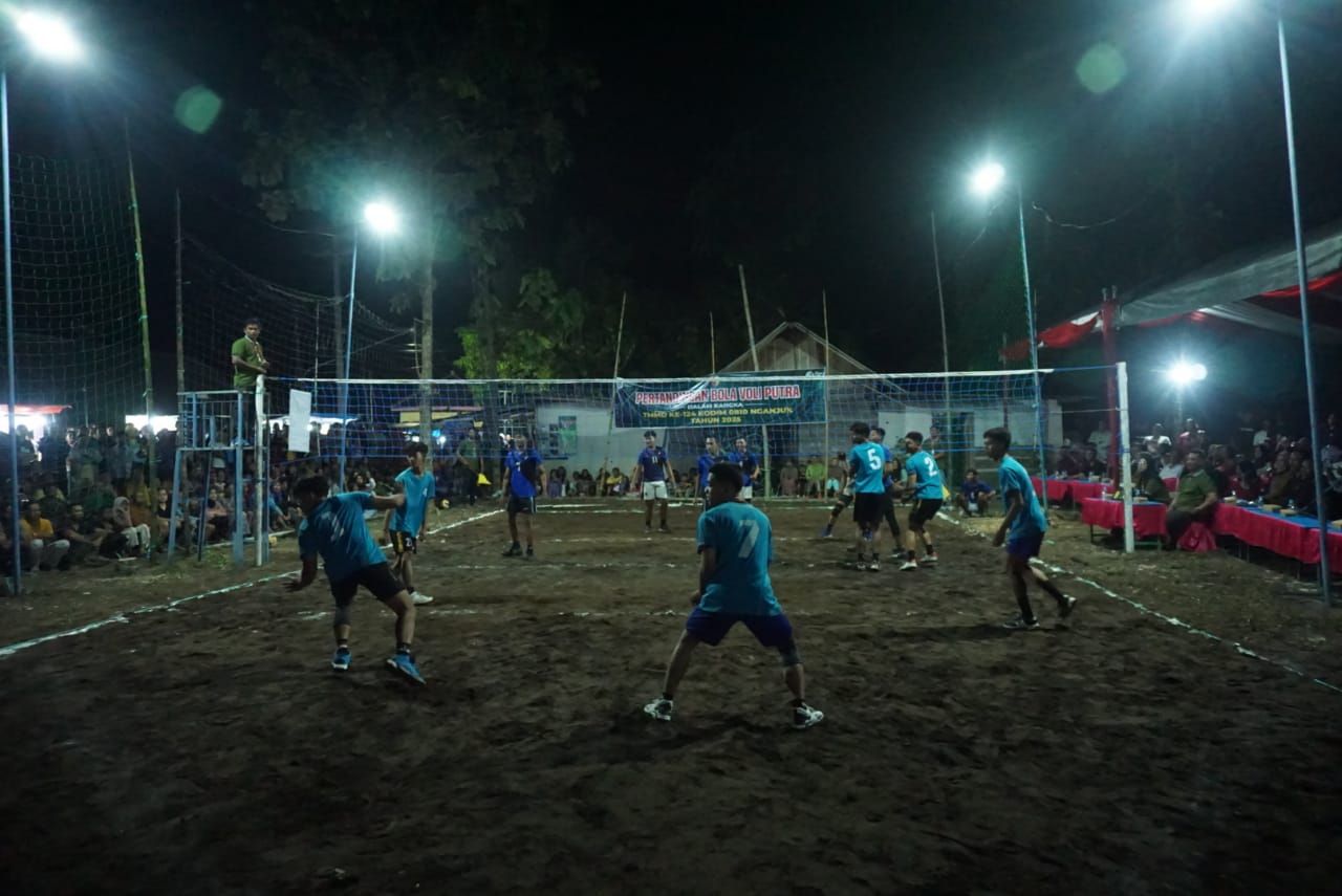 Warga berkumpul untuk menyaksikan tim-tim bola voli kebanggaan mereka bertanding. Saling dukung masing-masing tim membuat suasana menjadi semakin meriah.